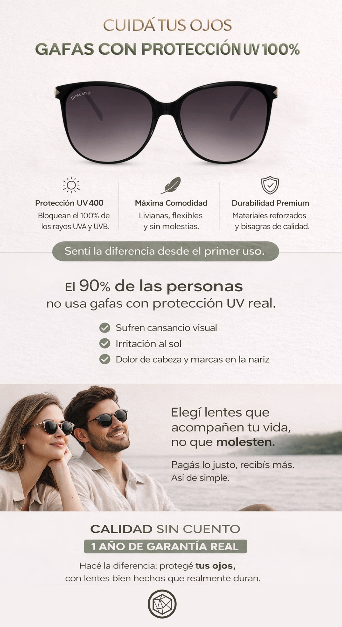 Su lente Negro con protección UV400 de categoría 3, bloquea el 100% de los rayos UV400A y UV400B, cuidando tu visión y evitando deslumbramientos.