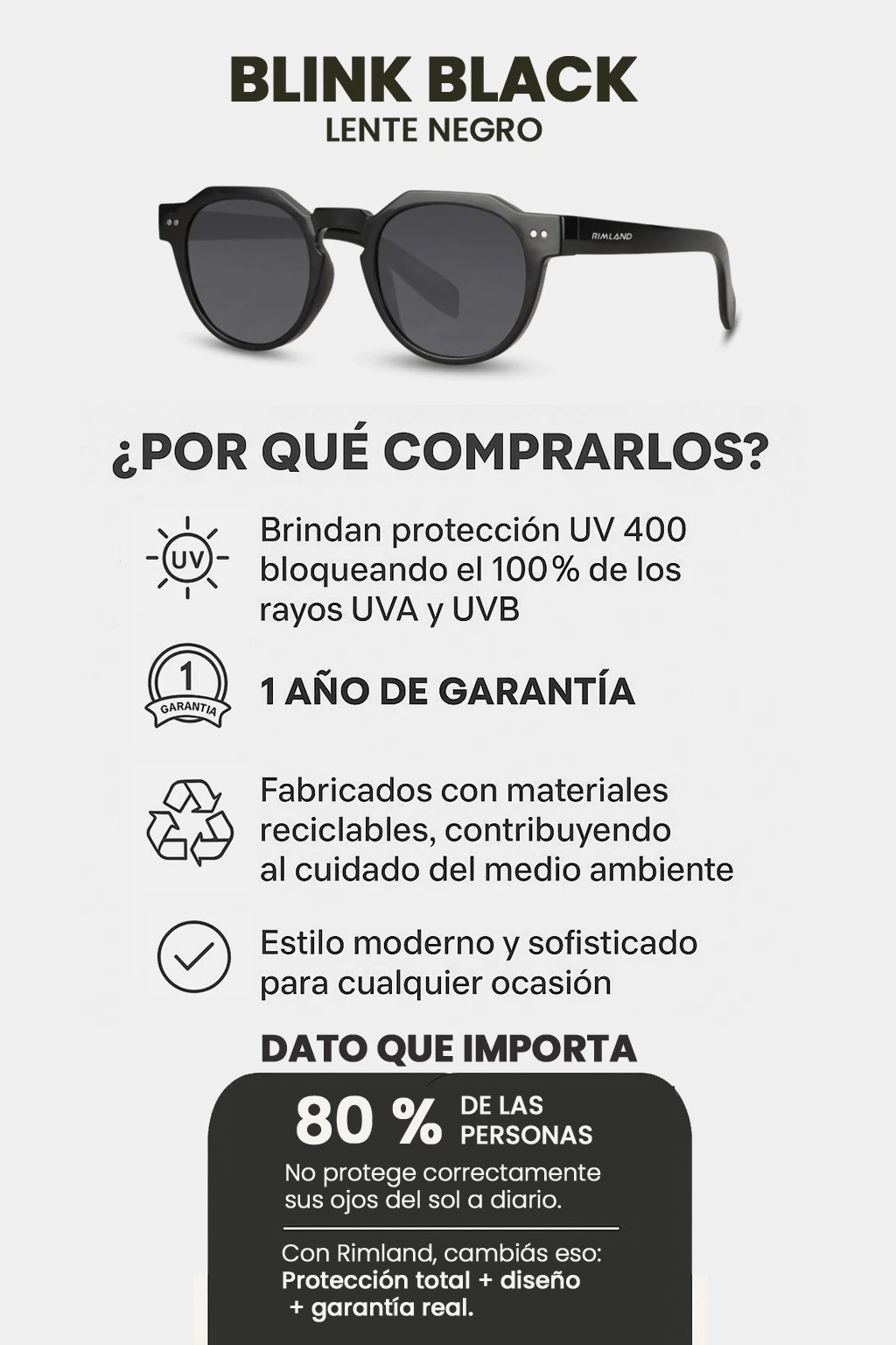 Nuestras gafas combinan diseño con protección UV100% de alta calidad (contra rayos UVA, UBV Y UV400) para que puedas disfrutar de una visión más nítida y cuidar tus ojos de los efectos negativos del deslumbramiento.