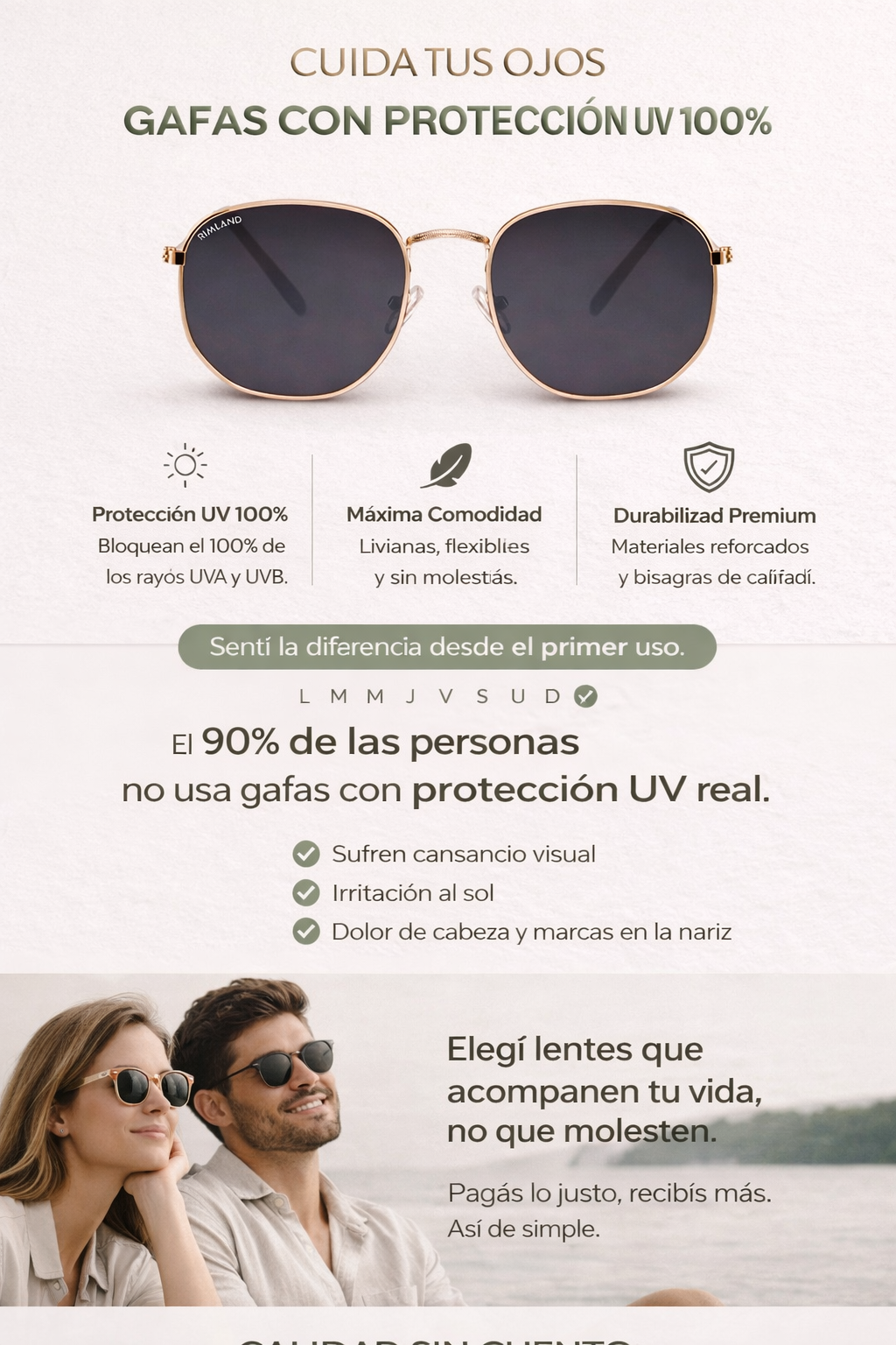 Con 1 año de garantía real, nuestras gafas están diseñadas para acompañarte todos los días, combinando estilo, comodidad y resistencia.