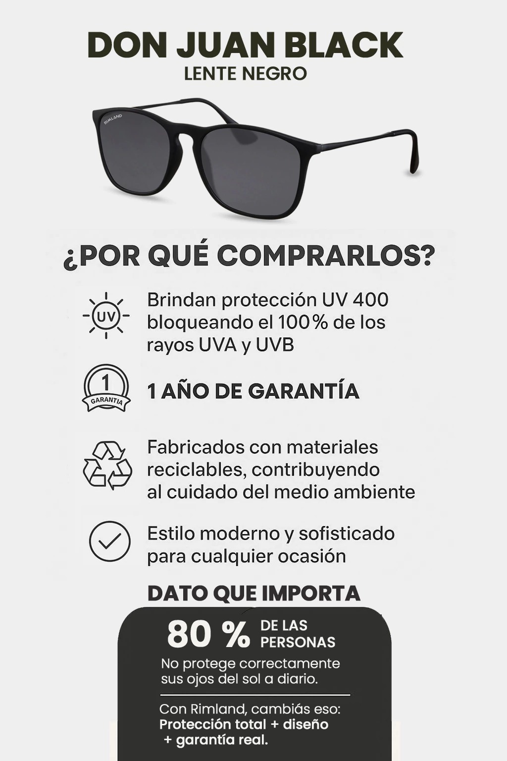 Nuestras gafas combinan diseño con protección UV100% de alta calidad (contra rayos UVA, UBV Y UV400) para que puedas disfrutar de una visión más nítida y cuidar tus ojos de los efectos negativos del deslumbramiento.