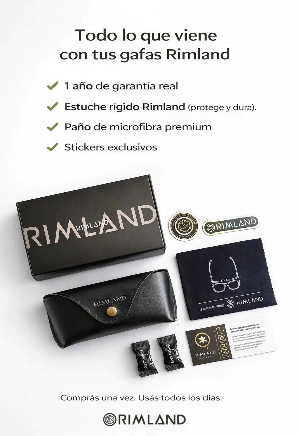Estuche rígido de cuero - Paño de microfibra - Packaging exclusivo Rimland - Stickers - Certificado de garantía.