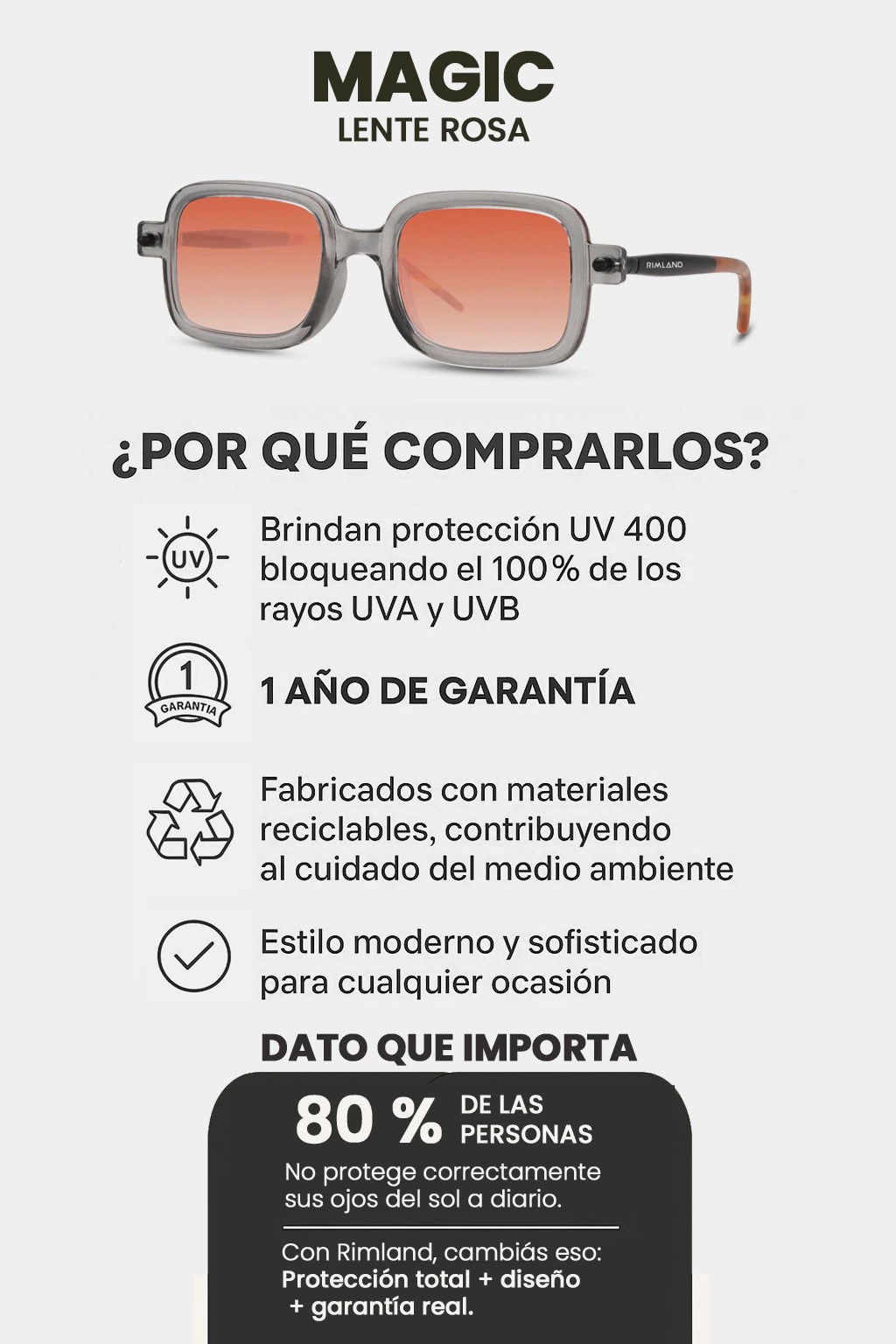 Con 1 año de garantía real, nuestras gafas están diseñadas para acompañarte todos los días, combinando estilo, comodidad y resistencia.