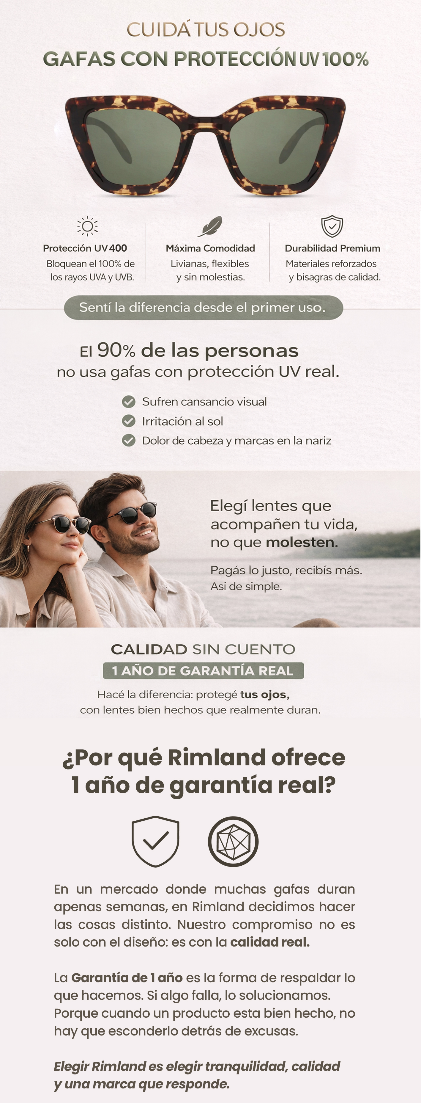 Fabricadas en acetato son resistentes a los golpes, no aprietan, no pesan y son cómodas para uso diario. Su lente TAC antirayaduras garantiza una visión nítida y mayor durabilidad.